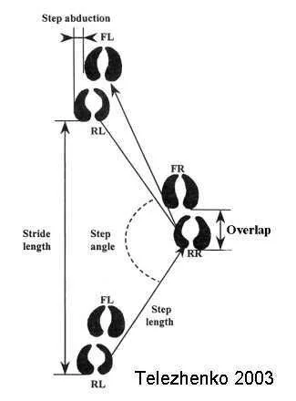 Claw prints of a cow show several components of walking - including stride, step, step angle, overlap and abduction. Observation of walking patterns provides an opportunity to assess floors for traction and flatness of surface for the claw to rest upon. In addition, "birdbaths" in concrete floors are health risks that pool wastes, contaminate feet and tails and allow splashing onto beds, teats or legs.